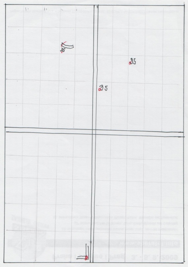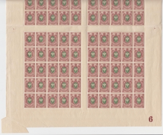 kompletní 100známkový arch se složkou papíru, s deskovým číslem a s deskovými vadami, viz schéma; přeloženo v perforaci