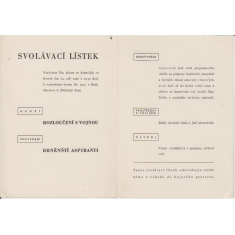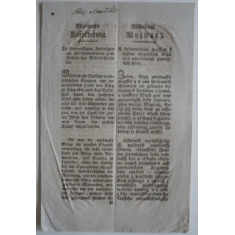 "Všeobecné vyzvání k dobrovolným snůškám k lůžkám vojanských špitálů zapotřebných povrchních věcí"; třílistý dokument A4, česko-německý text, včetně seznamu kusů povlečení na jedno lůžko, vydal Ignác hrabě Chorinský (1770–1823) v Brně; zajímavé, velmi hezké
