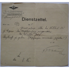 dvojjazyčná vojenská listina s rakouskou orlicí v záhlaví, stvrzena účast na vojenském cvičení Infanterie č. 8; otřepené okraje