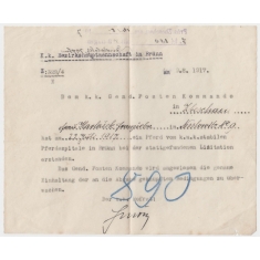 příkaz pro důstojníka Josefa Kratochvíla pro přepravu na železnici z města Radechiv (dnes Ukrajina) do Přerava, útvarová i drážní razítka, 4stránkový dokument A4; křížem přeloženo, přesto mimořádně hezké
