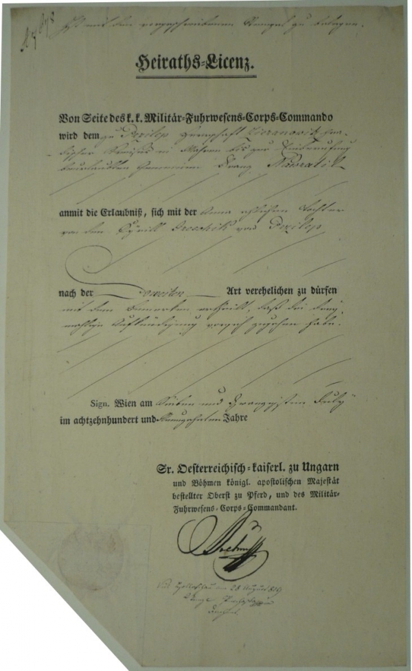 historická listina, oddací list šlechtice a příslušníka armády, suchá pečeť; bezvadné