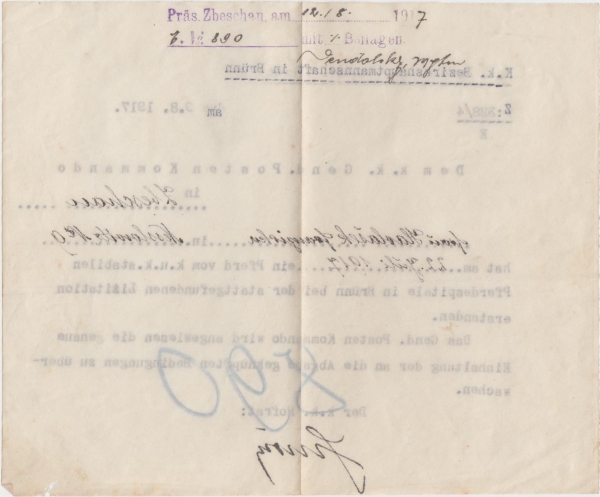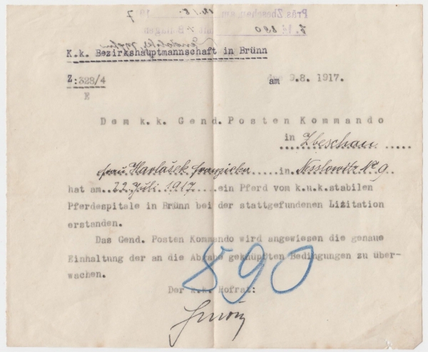 potvrzení pro paní Františku Havláškovou, Neslovice č. 9, o nabytí koně v dražbě, vydalo C. a K. Vrchní velitelství v Brně