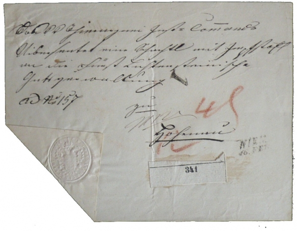 adresováno na vojenské velitelství Hohenau, podáno ve Vídni, expediční a příchozí poštovní razítko, úřední poznámky a nálepka