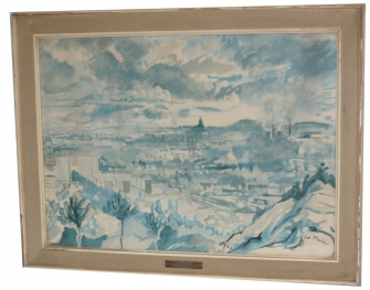akvarel, zaskleno v rámu 68x51cm, výřez 58x41cm, kovový dedikační štítek s textem: Dar Nár. výboru m. Brna/ Královopolské strojírně Brno/ k 80 letům založení podniku; osobní odběr v Modřicích nebo smluvní doprava