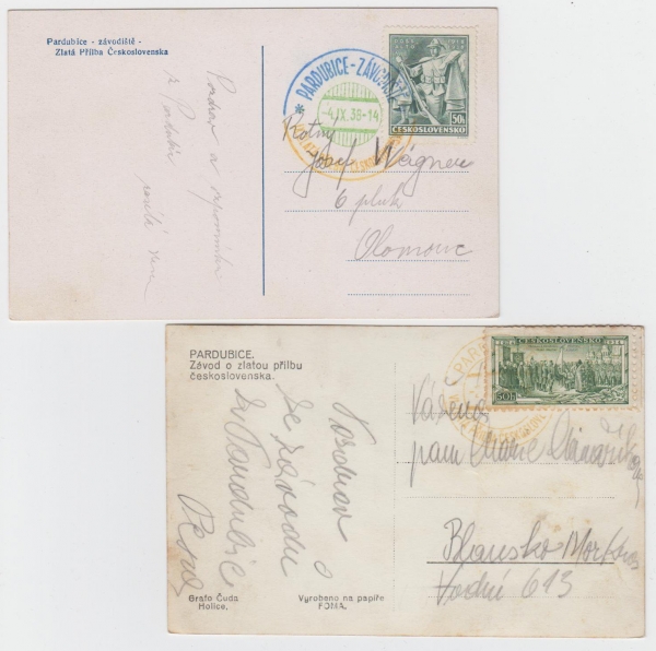 sestava 2 pohlednic s příležitostnými razítky 1934 a 1938