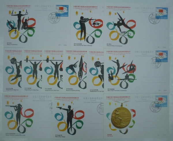 soubor 12 dopisnic s přítisky jednotlivých sportovních odvětví, v nichž Čína získala na bojkotované olympiádě zlaté medaile; luxusní stav