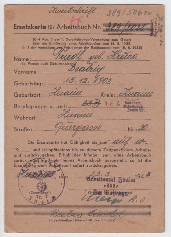 1946 Náhradní průkaz za pracovní knížku (Ersatzkarte)