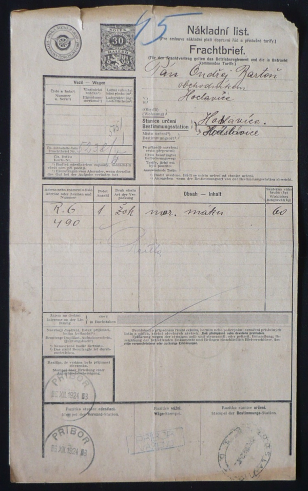 Nákladní list PŘÍBOR-HODSLAVICE
