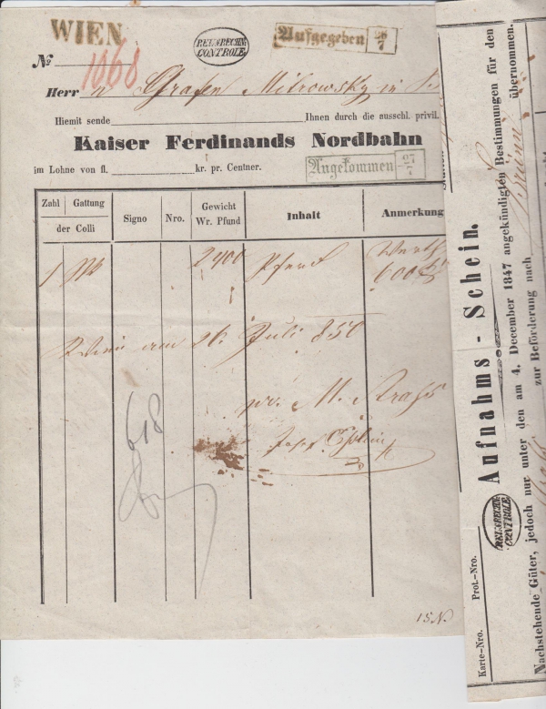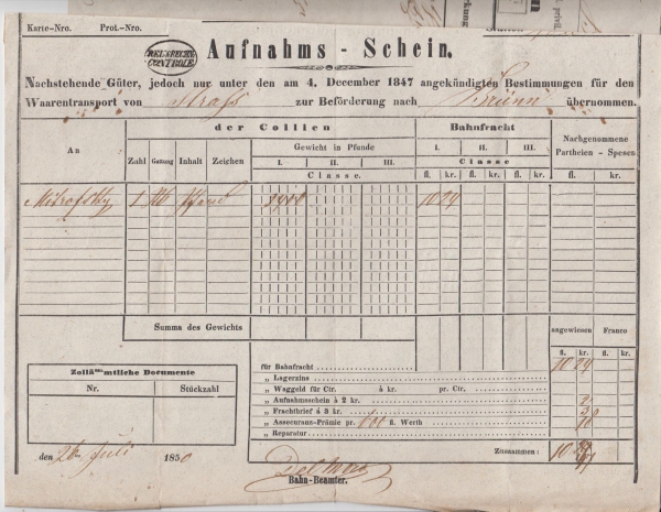1850 Nákladní list, účet za zboží a celní poplatky