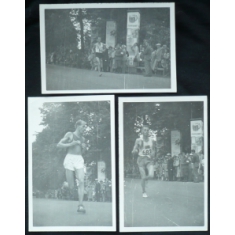 sestava 3ks fotografií, Zátopek, Corno, Jansson, nejlepší maratonci, pořízeno 27.7. 1952, není pohlednice