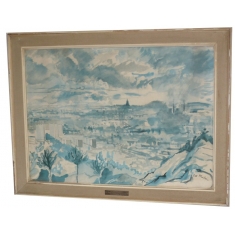akvarel, zaskleno v rámu 68x51cm, výřez 58x41cm, kovový dedikační štítek s textem: Dar Nár. výboru m. Brna/ Královopolské strojírně Brno/ k 80 letům založení podniku; osobní odběr v Modřicích nebo smluvní doprava