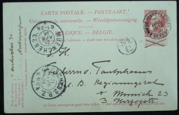 dopisnice pro nedělní doručení - přeškrtnuto, razítko ANVERS 20.IV.06 (pátek), průchozí a příchozí razítka