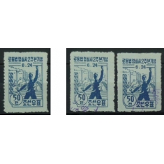 sestava 3 známek, 1x nepoužitá, 2x s fialovým razítkem