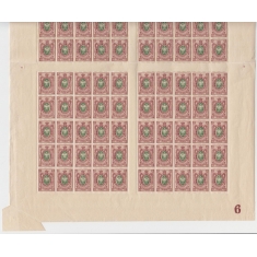kompletní 100známkový arch se složkou papíru, s deskovým číslem a s deskovými vadami, viz schéma; přeloženo v perforaci