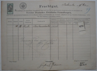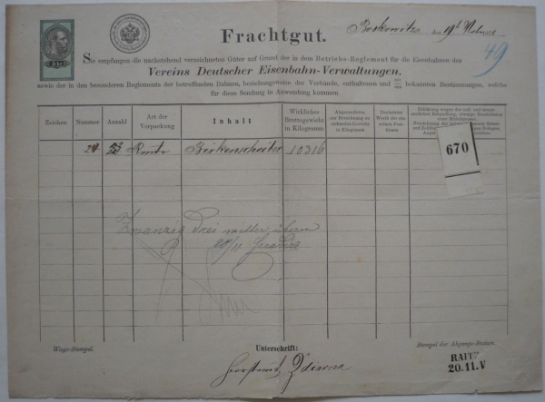 železniční nákladní list CNL 1 s předtištěným (!) kolkem emise 1875, železniční razítka, velmi dobře zachován