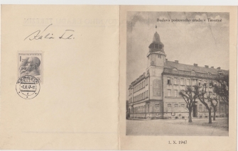 nálepní list Budova poštovního úřadu v Terezíně 1.X.1947 se známkou TGM, razítko TEREZÍN 1.X.47; zajímavé