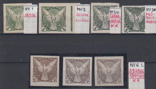 NV1 obtisk, NV2 s lištou, NV2 a), NV2 a) průsvitný papír, NV6 I. typ 3 barevné odstíny