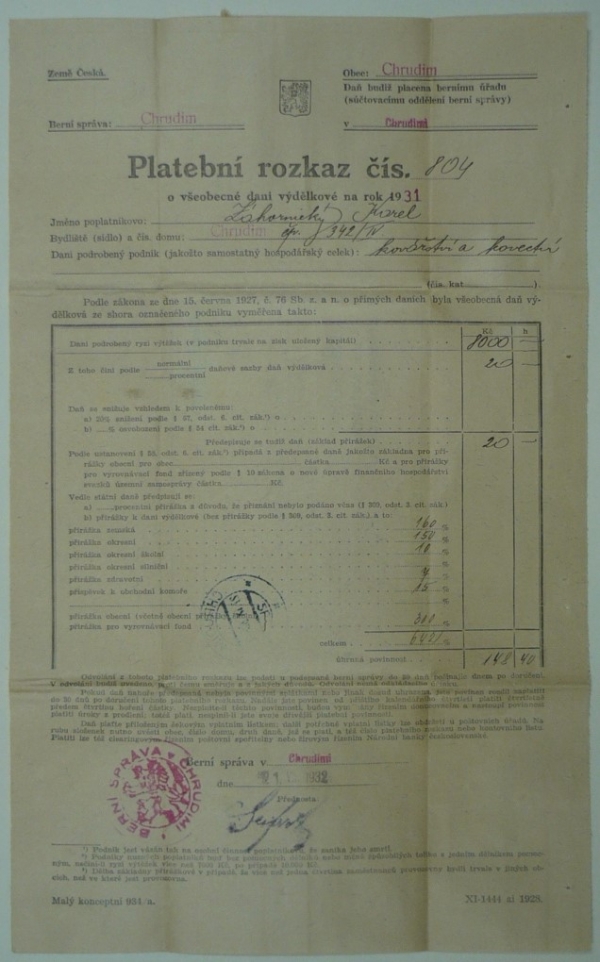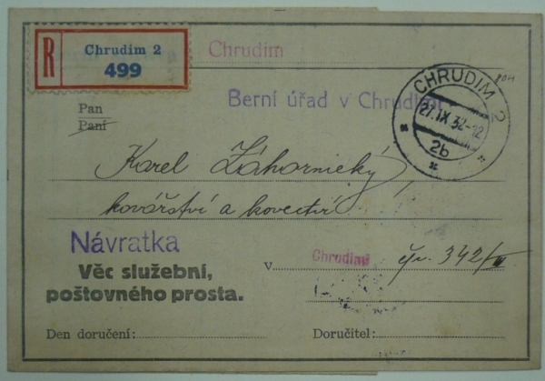 zasláno doporučeně v místě, razítko CHRUDIM 27.IX.32; luxusní stav