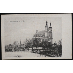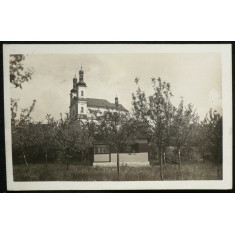 fotopohlednice, pohled ke kostelu z ovocného sadu, prošlá, Q1