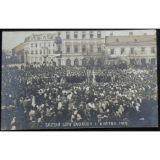 fotopohlednice, sázení lípy svobody 1.5.1919, prošlá, stržená známka, Q2