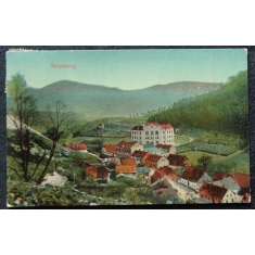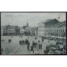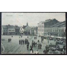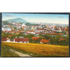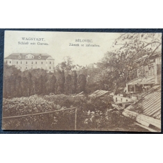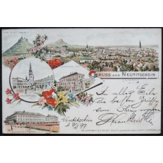 litografická koláž, tabáková továrna, náměstí, Německý dům, hrad, celkový pohled, prošlá, dlouhá adresa, Q3 - poškozený roh