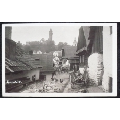fotopohlednice, ulička, povozy, drůbež, nepoužitá, Q2 - stopy po nalepení