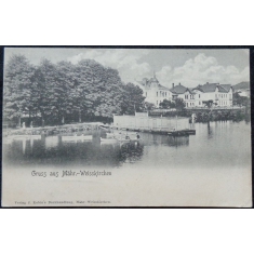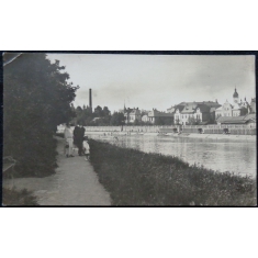 fotopohlednice, pohled přes řeku, lidé, prošlá, Q3 - zlomený roh
