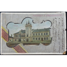 okénková koláž, radnice, prošlá, dlouhá adresa, stržená známka, Q3 - poškozený roh a částečně rozlepená