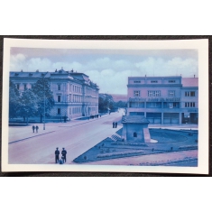 fotopohlednice, modrý odstín, pohled do ulice, spořitelna, nepoužitá, Q1