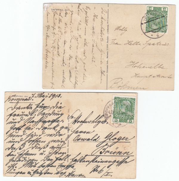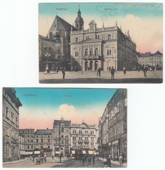 Opava (Troppau), sestava 2 pohlednic, mj. tramvaj a cisterna