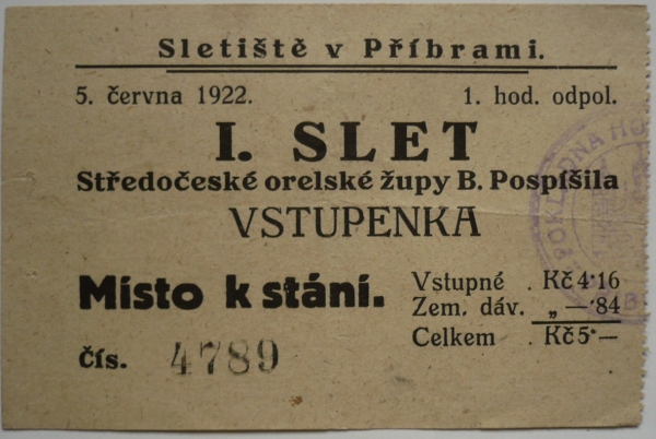 I. orelský slet Středočeské župy B. Pospíšila / vstupenka k stání, Příbram 5.6.1922