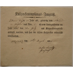 potvrzení pro krávu z Nebovid (okr. Brno-venkov), že nemá kravské neštovice, vydáno v obci Blažovice (okr. Brno-venkov); zajímavý dokument z historie veterinární praxe; luxusní stav