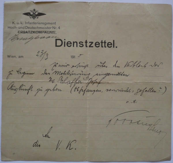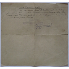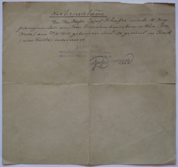 úřední dokument na jméno Josef Schaffer, zajat v Tomsku, výrazný křížový sklad