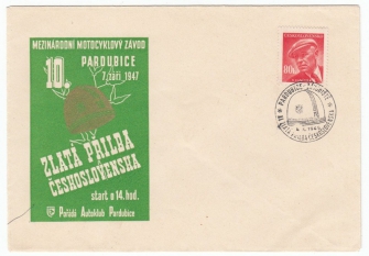 příležitostné razítko PARDUBICE-ZÁVODIŠTĚ 4.XI.1949/ XI. Zlatá přilba; dobrý stav