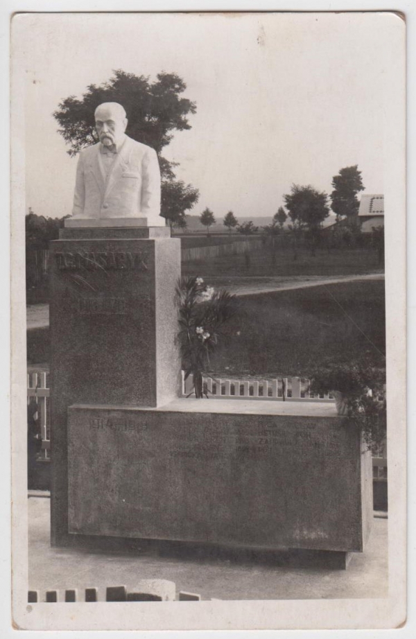 původní pomník obětem války 1914-1918, Tomáš G. Masaryk, na pomníku jména: Švanda, Míča, Netušil, Zahrádka, Pižl, Jukl, Krupička, ..., foto Otakar Tichý, Chlumec n./C.; Q2 - růžky