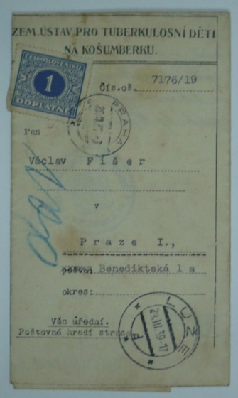 upomínka z ústavu Luže do Prahy, zatíženo doplatným 1K, PRAHA 29.III.39; lehká patina