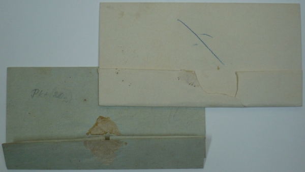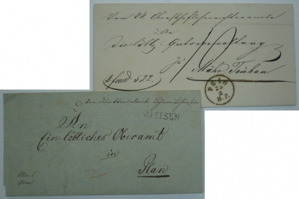 řádkové razítko a kruhové razítko, sestava 2 skládaných dopisů; hezké