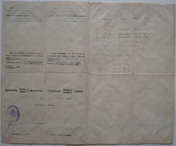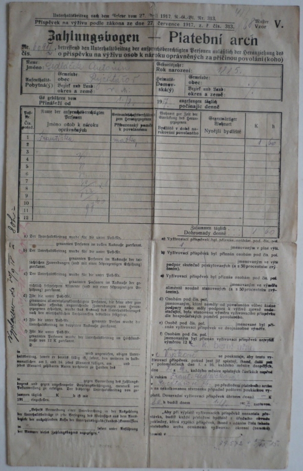 1917 Platební arch o příspěvku na výživu osob