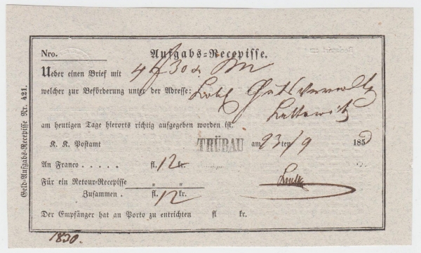 1850 Podací lístek MORAVSKÁ TŘEBOVÁ