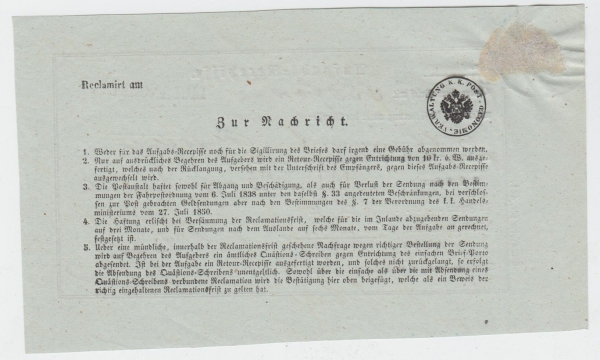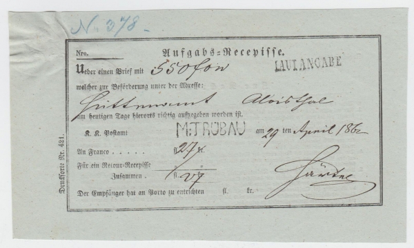 1862 Podací lístek MORAVSKÁ TŘEBOVÁ