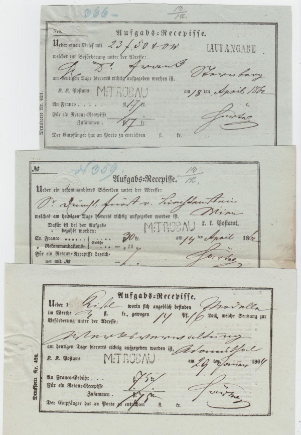 1862 Podací lístky MORAVSKÁ TŘEBOVÁ