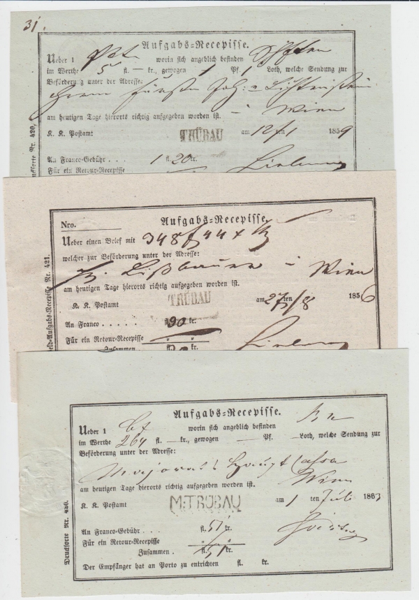 1856 Podací lístky MORAVSKÁ TŘEBOVÁ