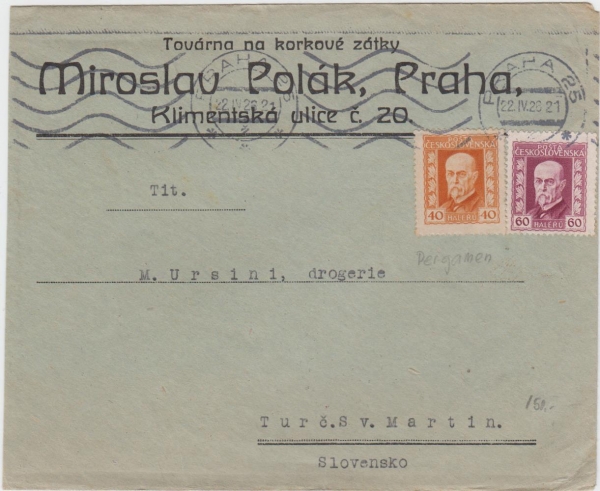 firemní dopis s frankaturou Masaryk - neotypie 40h oranžová na pergamenovém papíru, PRAHA 22.IV.26