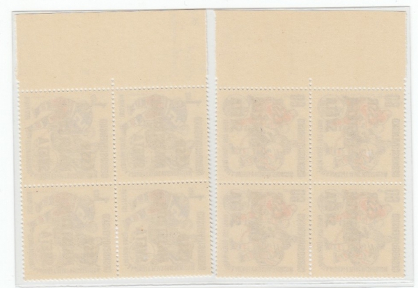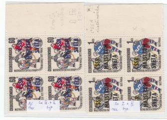 hodnota 60h 2x spojené typy IV.+V., navíc desková vada DV 20 - seříznuté písmeno "I" (MISTREM), hodnota 1Kčs spojené typy I.+III., navíc DV 24 - kratší pravá nožka "R" (ČSSR); vše svěží, katalog minimálně 720Kč