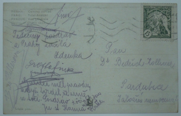 pohlednice zaslaná z Prahy do Pardubic, horší otisk strojového razítka