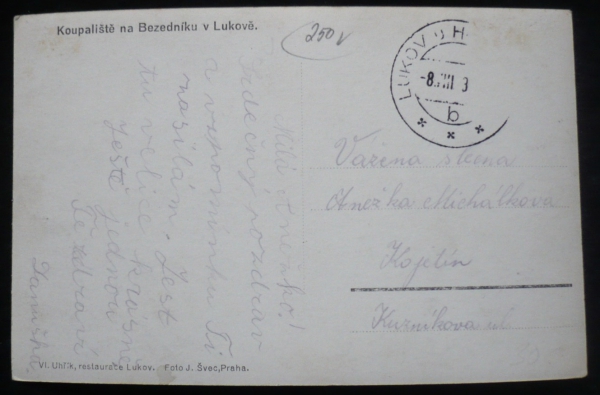 Lukov, fotopohlednice, koupaliště na Bezedníku, prošlá, stržená známka, Q2