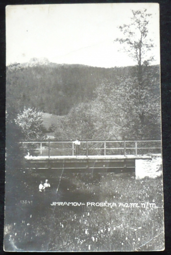 Jimramov, fotopohlednice, hoch na mostě, v pozadí Prosička, prošlá, Q3 - ohyb