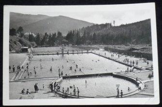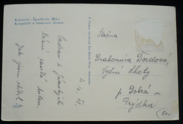 Špindlerův Mlýn, fotopohlednice, koupaliště a kurty, prošlá, stržená známka, Q3 - poškozený roh