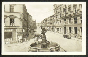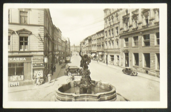 Olomouc, pohled do ulice, kašna, fotopohlednice, prošlá, stržená známka, Q2