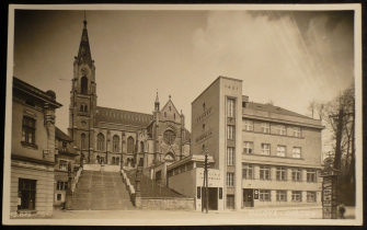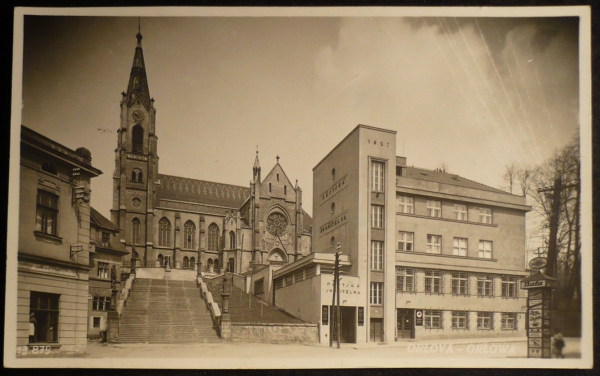 Orlová, fotopohlednice, kostel, spořitelna, nepoužitá, Q1